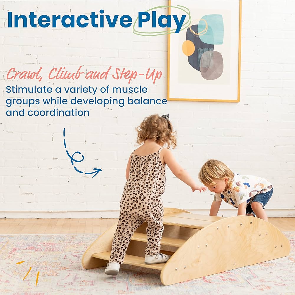 Encourage active play and healthy development with the Kids 2-in-1 Step ‘N Rock, a Montessori-inspired wooden climber designed to support toddlers through movement, balance, and coordination. This versatile indoor playset easily flips from a rocking teeter-totter to a climbing step ramp, offering hours of open-ended, imaginative, and interactive play.